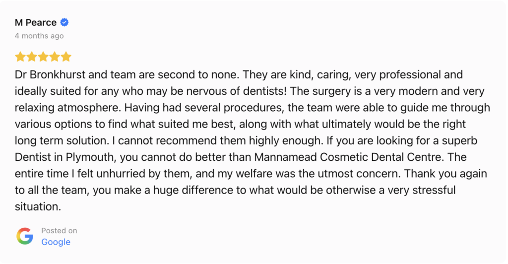 We completely understand that visiting the dentist can be daunting. Our Mutley Plain clinic is designed to be a calm, welcoming, and entirely judgement-free environment. Our Principal Dentist, Dr Lenore Bronkhorst, has 40 years of experience and a special interest in treating nervous patients.