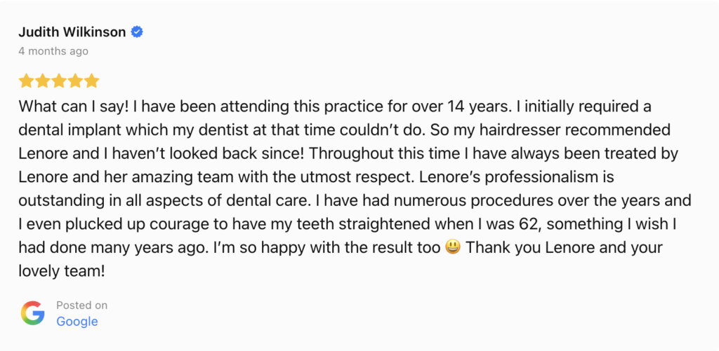 Your teeth straightening journey will be overseen by our Principal Dentist, Dr Lenore Bronkhorst. Celebrating 40 years in dentistry, Dr Bronkhorst is an internationally trained Cosmetic Dentist and a highly experienced Invisalign Provider.