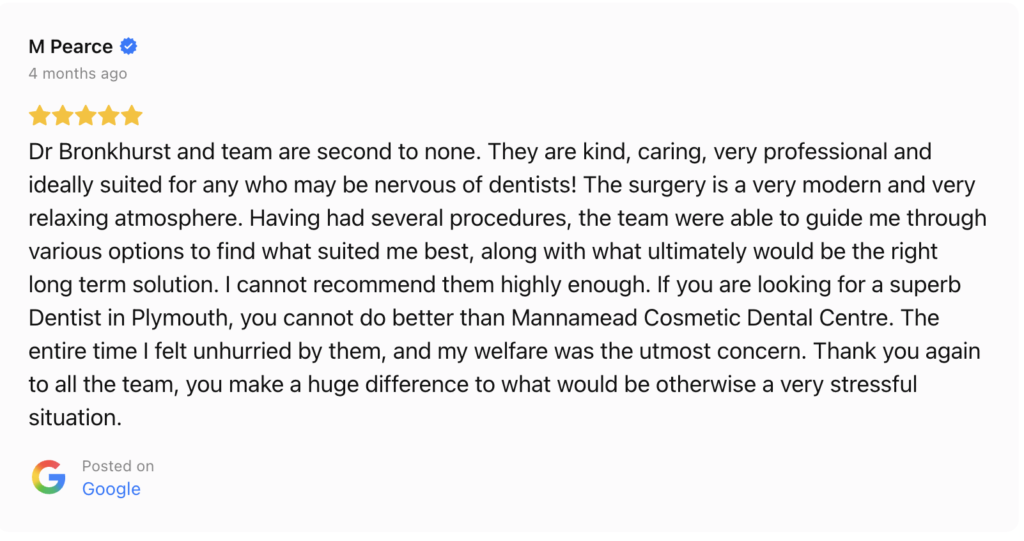 Many of our patients travel from Ivybridge, Torpoint, Derriford, and beyond specifically to benefit from Dr Bronkhorst’s expertise in caring for nervous patients. Simply contact our friendly reception team to book your initial consultation.